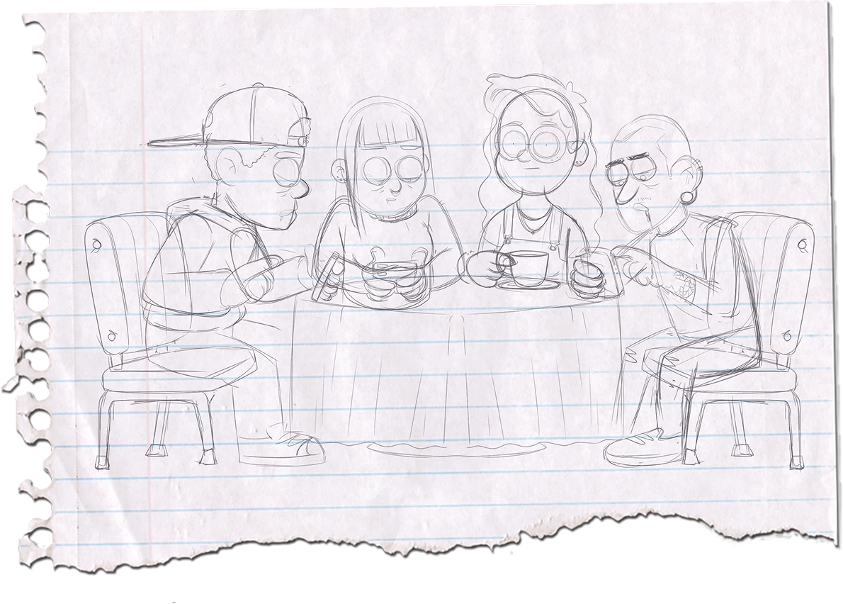 Social Addicts is a small personal animation about modern disconnection. In the scene, a group of friends sits together at a table, but only one of them tries to start a real conversation. The others are completely absorbed in their phones, lifting their heads for just a second before returning to their screens.